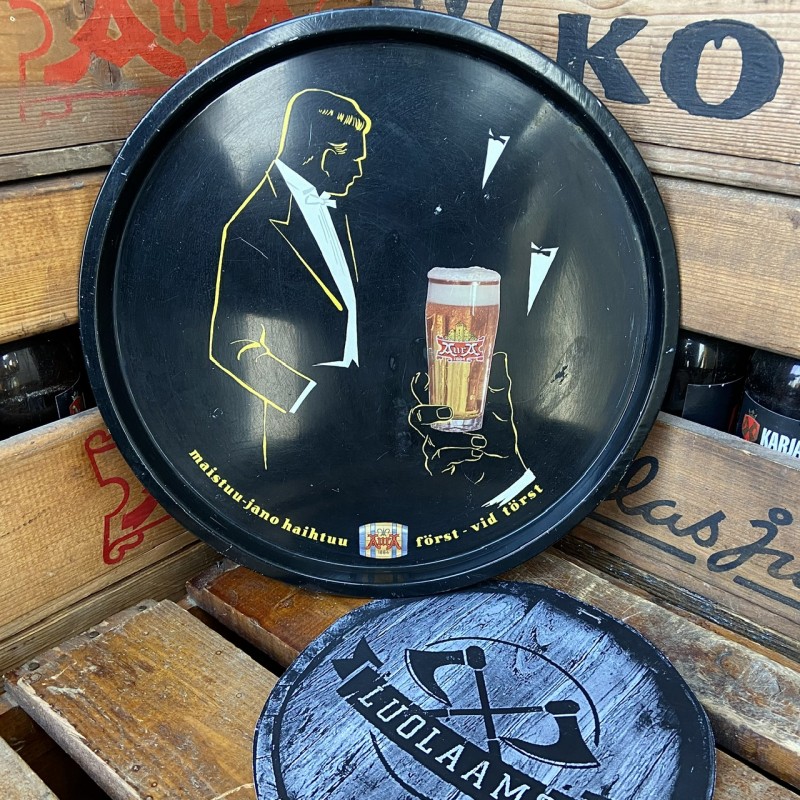 Vanha Auran oluttarjotin keräilijän kokoelmiin, tarjoilukäyttöön tai tee tästä vaikka seinäkello! Näitä ei liiaksi ole. Huomioi, ettei ole priimakuntoinen, mutta ajaa asiansa vielä!