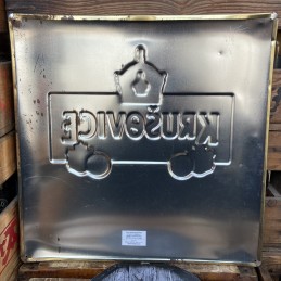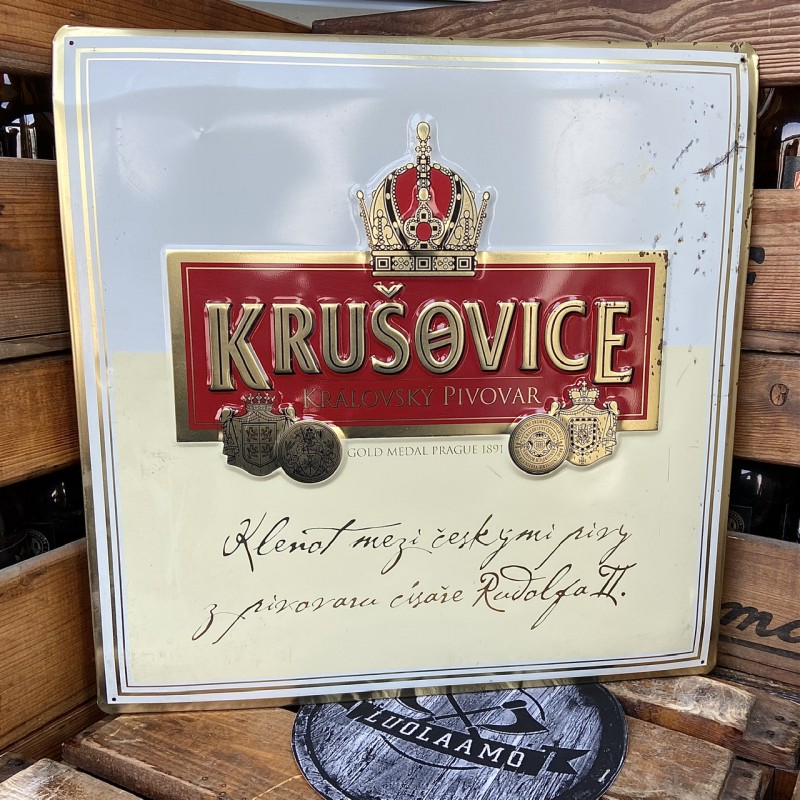 Tästä laadukas ja tyylikäs kohoprässätty Krušovice peltikyltti! Valmistaja SMALT BRNO.